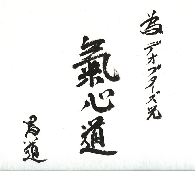 Calligraphie réalisée et offerte, le 1octobre 2008, par maître Masamichi Noro à maître Michel-Laurent Dioptaz. (voir site de M.L.Dioptaz:www.dioptaz.com)
